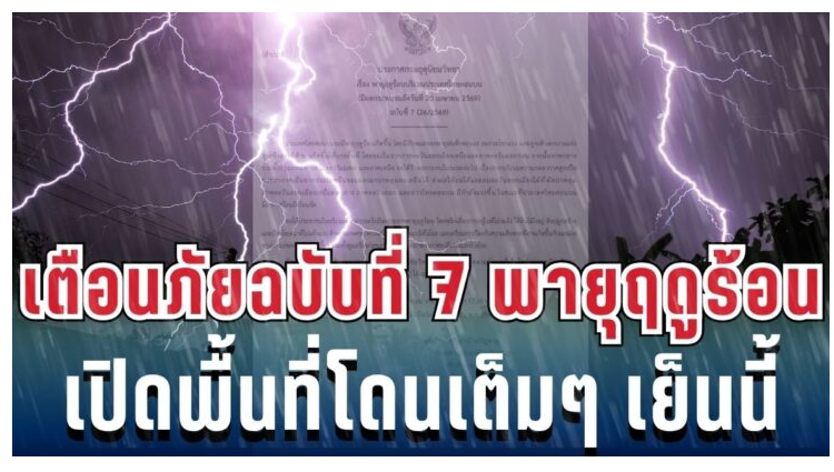 วันที่ 17 เมษายน 2569 กรมอุตุนิยมวิทยา ออกประกาศเตือนฉบับที่ 7 เรื่อง พายุฤดูร้อนบริเวณประเทศไทยตอนบน มีผลกระทบจนถึงวันที่ 20 เมษายน 2569 โดยประเทศไทยตอนบนจะมีพายุฤดูร้อนเกิดขึ้น ลักษณะเป็นพายุฝนฟ้าคะนอง ลมกระโชกแรง และมีลูกเห็บตกบางแห่ง รวมถึงอาจเกิดฟ้าผ่าในบางพื้นที่ เริ่มจากภาคตะวันออกเฉียงเหนือและภาคตะวันออก ก่อนขยายผลกระทบไปยังภาคกลาง รวมทั้งกรุงเทพมหานครและปริมณฑล และภาคเหนือในระยะถัดไป