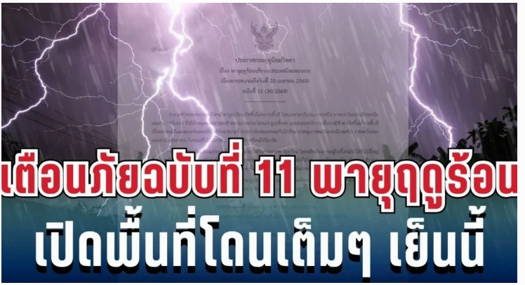 กรมอุตุนิยมวิทยา ประกาศเตือนฉบับที่ 11 เรื่อง พายุฤดูร้อนบริเวณประเทศไทยตอนบน มีผลกระทบจนถึงวันที่ 20 เมษายน 2569 โดยระบุว่า ประเทศไทยตอนบนยังคงมีพายุฤดูร้อนเกิดขึ้นในหลายพื้นที่ โดยเฉพาะภาคเหนือ ภาคตะวันออกเฉียงเหนือ และภาคตะวันออก มีลักษณะเป็นพายุฝนฟ้าคะนอง ลมกระโชกแรง ลูกเห็บตก ฝนตกหนัก และอาจมีฟ้าผ่าบางพื้นที่